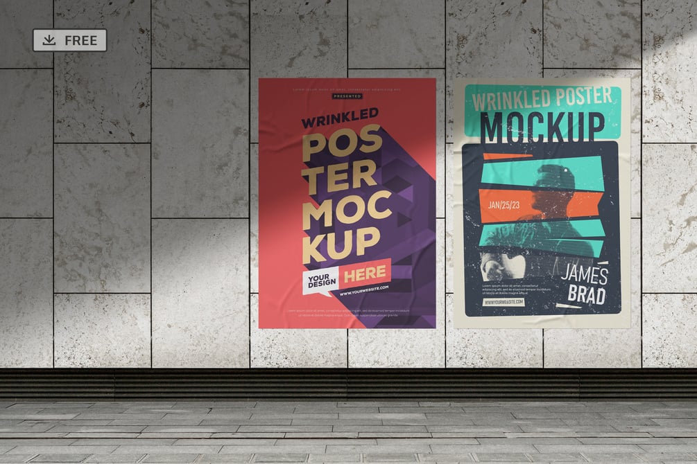 Wrinkled poster mockup showing a city wall plastered with posters. suitable for visualizing your designs such as event posters, brochures, advertisements and so on.